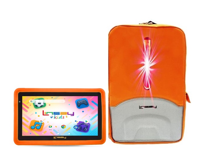 LINSAY F7XHDKIDSBEPORANGE has a high resolution display 1024x600 HD Panel Screen widescreen 16:9 for an incredible multimedia experience. It also has a Built in Front Web Camera 2.0Mp for Video Live chat and a 2.0Mp Built in Back Camera to take stunning photos and videos.